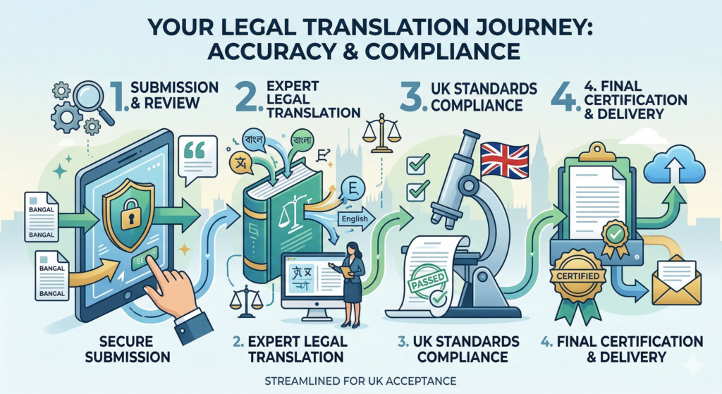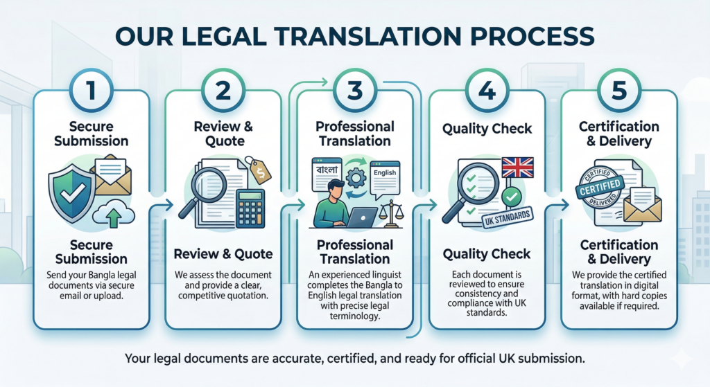 We follow a structured process to ensure accuracy and compliance in every certified Bangla legal translation UK.